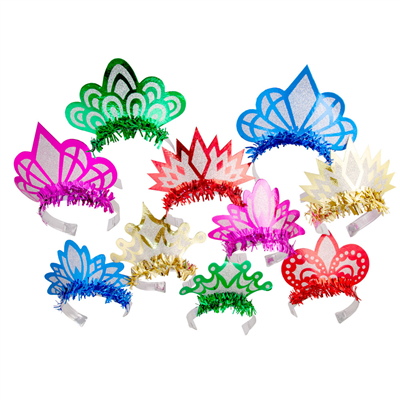 Fabriquées en carton, ces tiares mesurent environ 17,5 cm. Cette taille est adaptée pour être portée confortablement par la plupart des adultes. L’assortiment garantit une diversité visuelle plaisante, évitant l’uniformité et ajoutant du dynamisme. Le matériau carton est léger et facile à manipuler par votre personnel lors de la préparation.